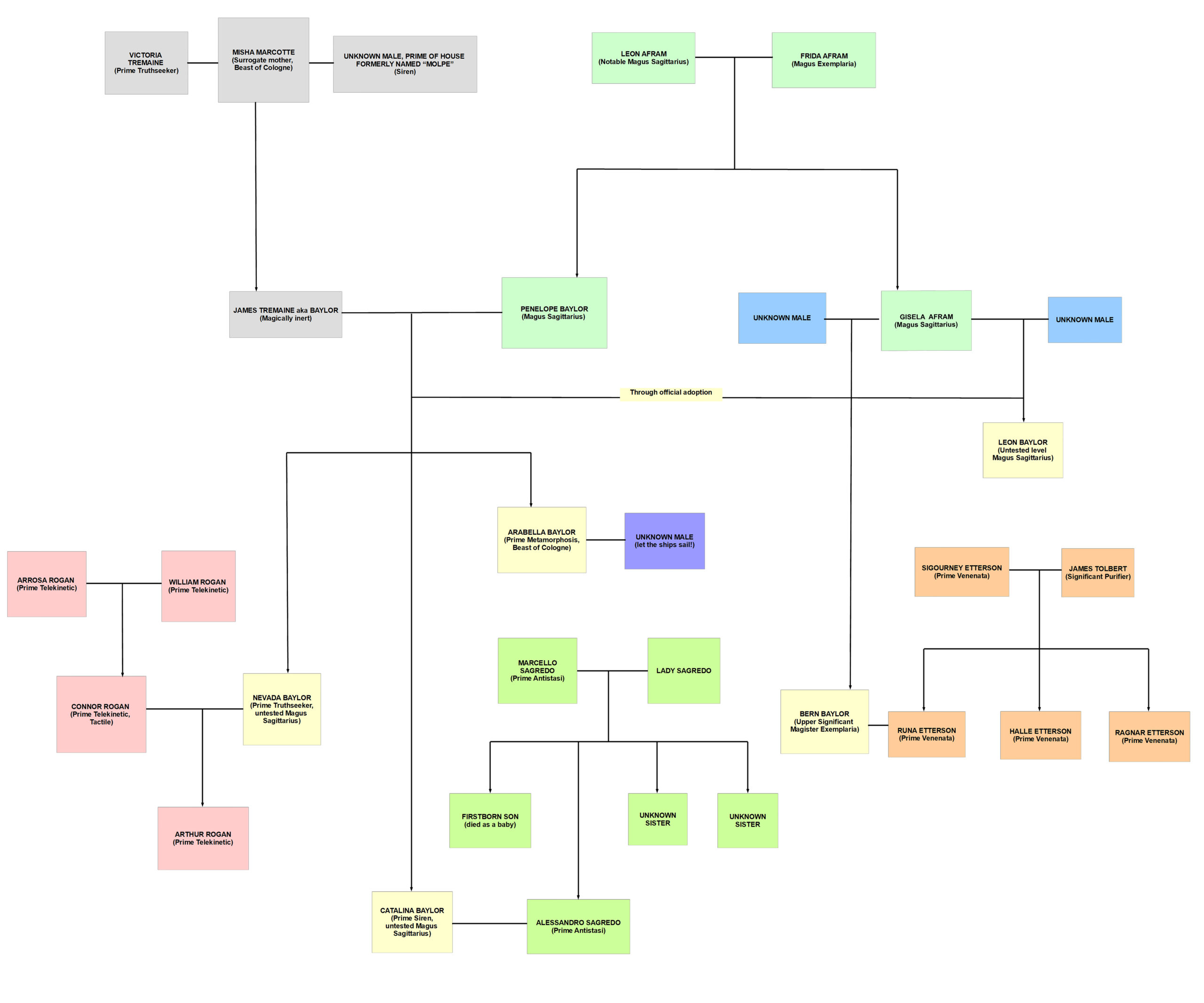 James Baylor: A magic carrier, but with no manifest magic talent of his own. Son of Victoria Tremaine, he ran away from her and lived his entire life in hiding. He chose the surname Baylor at random from a Houston telephone book, picking one of the most common options. Married Penelope when they were both very young and became primary carer for the children when she went in the military. With Penelope, formally adopted her nephews, Bern and Leon. Started Baylor Investigative Agency and set the family up with a way to earn their living as well as a solid principle foundation on how to live their lives. Died of malignant peripheral nerve sheath tumour (MPNST) when Nevada was 19.